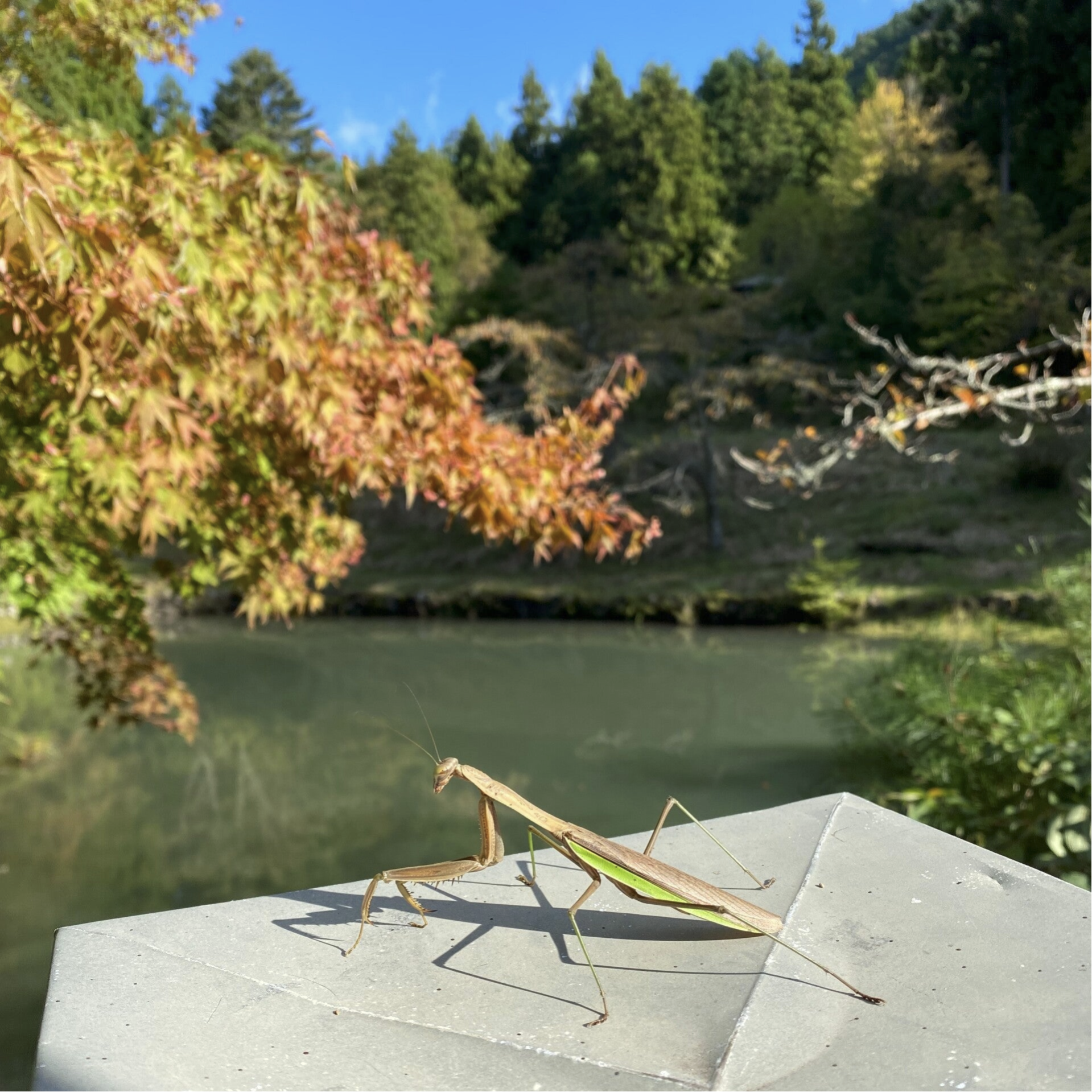 Later, tijdens een tocht in de bergen, ontdekte ik een meer, diep verscholen in het groen. Een natuurlijke, wilde tuin. De plek heette, als ik het mij goed herinner, “Dragon Hill”. Enkel te bereiken via een lange klim en een smalle bosweg. Daar, bij het water, ontvouwde zich een oase van rust. De eerste herfstkleuren spiegelden in het wateroppervlak, en een enorme bidsprinkhaan begroette ons als wachter van dit heiligdom. Alles voelde… perfect. Of beter: volmaakt in zijn onvolmaaktheid.